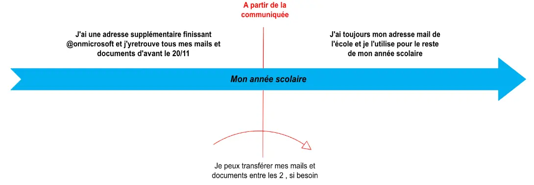 Si vous étiez déjà étudiant/intervenant l’année dernière , vous pourrez utiliser la même méthode pour vous connecter sur OFFICE 365,  https://www.office.com/ à votre compte avant la migration et récupérer vos mails et documents en utilisant l’adresse  ONMICROSOFT (cf le mail qui vous a été envoyé), l'adresse est en fontion de votre école :